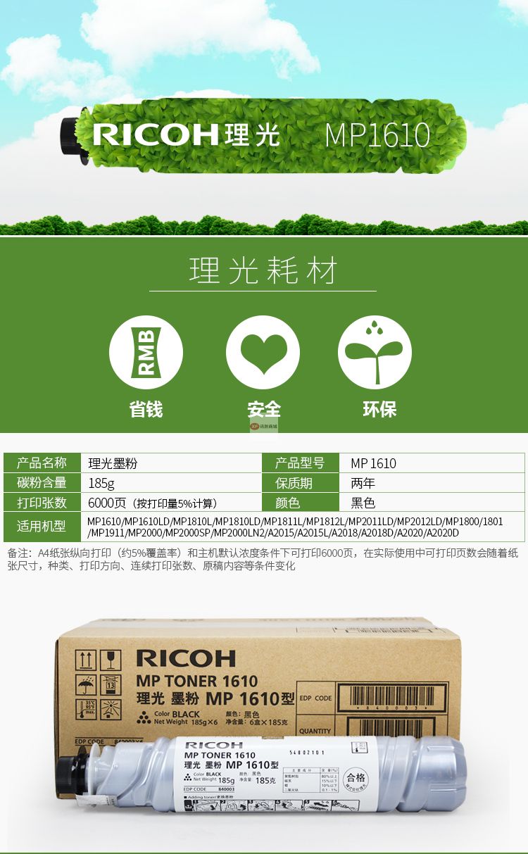 商品名稱:理光(Ricoh)MP 1610 黑色碳粉 適用MP1610/1810/1812L/2011LD/2012LD/A2015