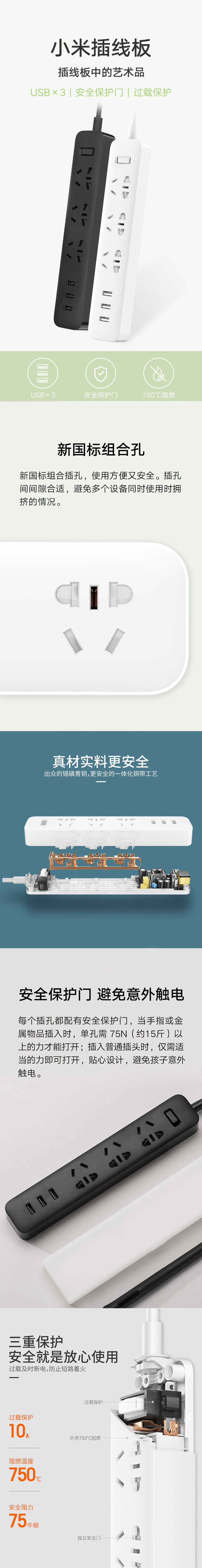商品名稱:小米 插線板 XMCXB01QM 白色 3位5孔總開 3個USB接口 排插/插座/轉(zhuǎn)換器