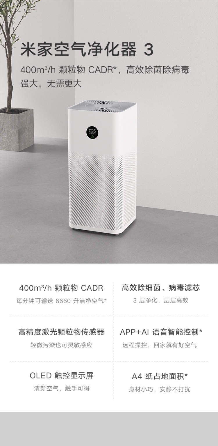 商品名稱:小米(MI)AC-M6-SC 米家空氣凈化器3 400m3/h