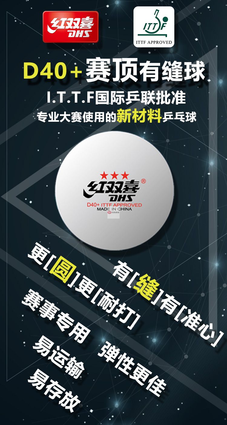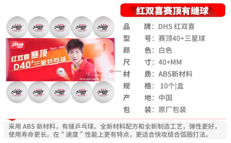 商品名稱:DHS紅雙喜乒乓球三星 賽頂ABS新材料40+ 3星專業(yè)比賽球 白色