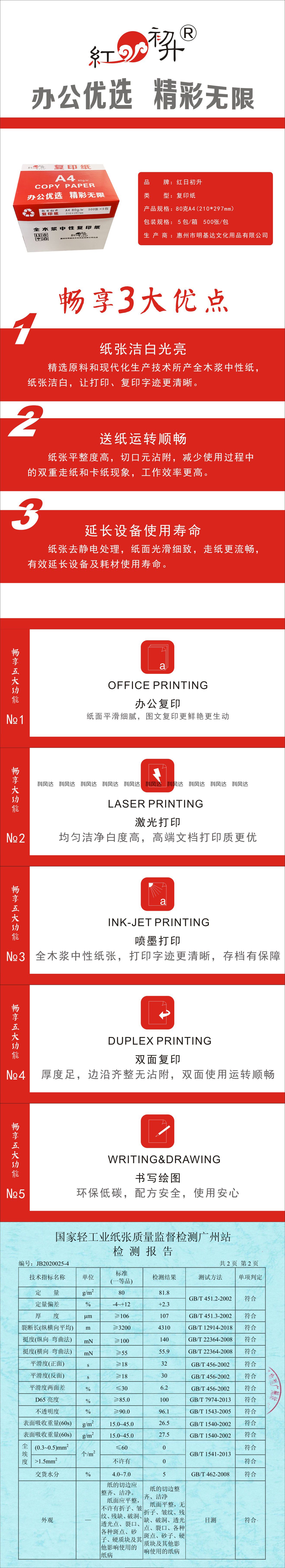 自營紅日初升 A4 80g 復(fù)印紙 500張/包 5包/箱