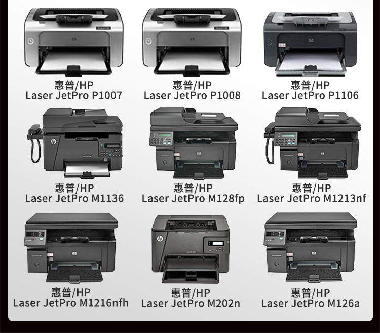 • 適用機(jī)型:HP LaserJet P1007/P1008 / HP LaserJet Pro P1106/P1108 HP LaserJet Pro M1136/M1213nf/M1216nfh/M1218nfs MFP/ MFP M226dw M202d/ M202dw/M126nw/M128fh/M128fp/ M128fw/M226dn/M202n/M126a/M1139mfp/M1219nf