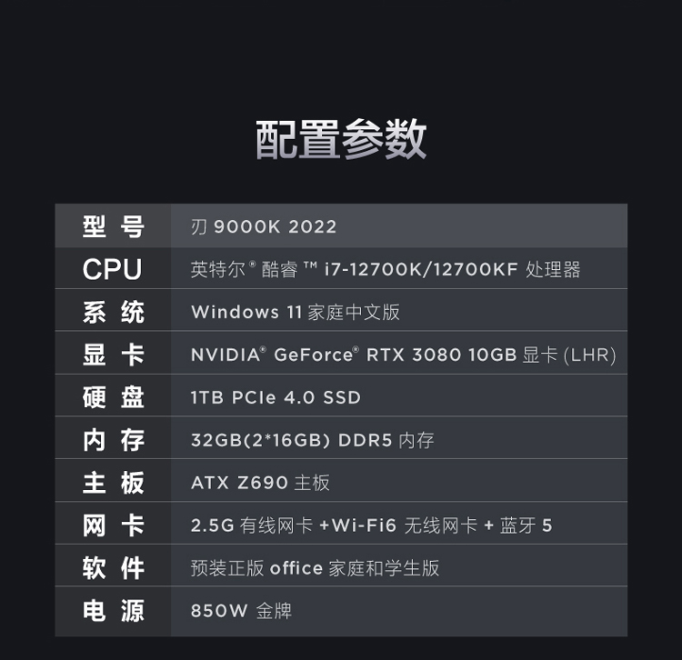 商品名稱:聯(lián)想(Lenovo)拯救者刃9000K 2022游戲電腦主機(12代酷睿i7-12700KF RTX3080 10GB LHR顯卡32G DDR5 側(cè)透 )