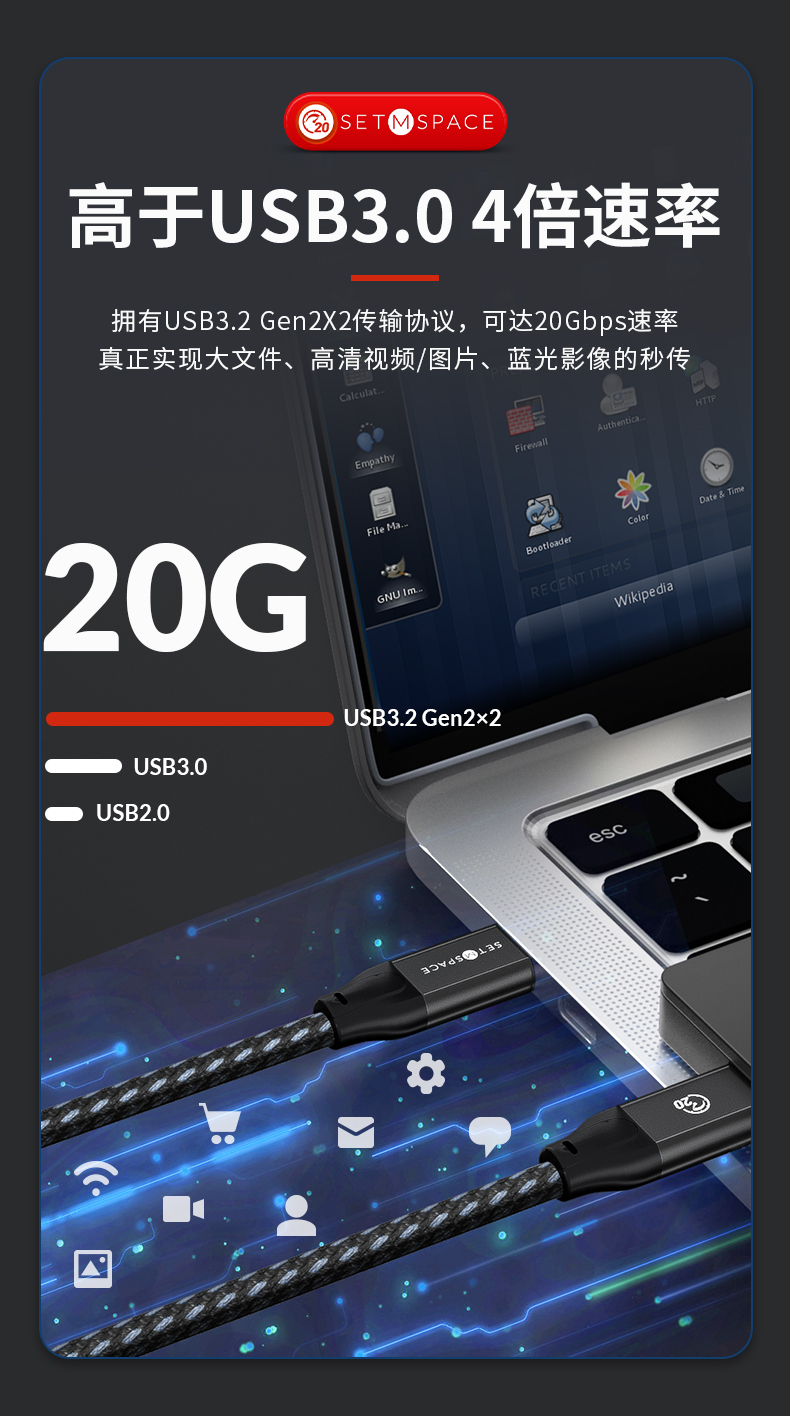 自營(yíng)SETMSPACE (合金桌面)USB3.2Gen2*2全功能type-c數(shù)據(jù)線顯示器視頻連接線快充 20Gbps USB3.2 C直-C直 線長(zhǎng)0.5m