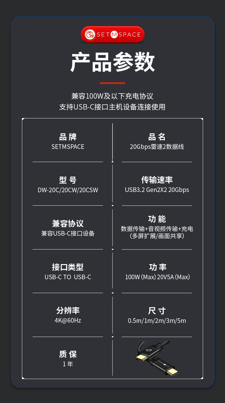 商品名稱:SETMSPACE (合金桌面)USB3.2Gen2*2全功能type-c數(shù)據(jù)線顯示器視頻連接線快充 20Gbps USB3.2 C直-C直 線長(zhǎng)0.5m