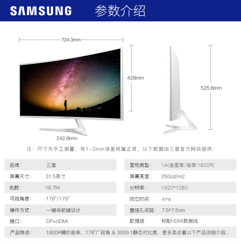 商品名稱:三星(SAMSUNG)C32F395FWC 31.5英寸 可掛壁曲面顯示器