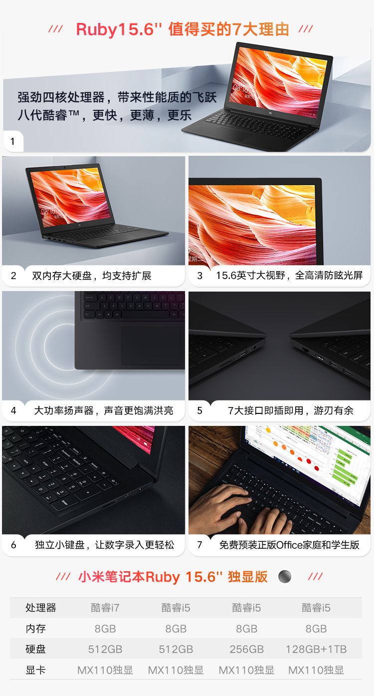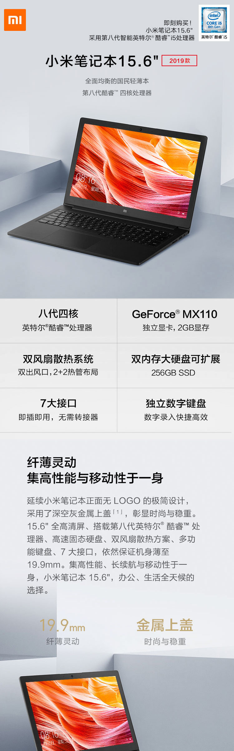 商品名稱:小米 (MI)Ruby 2019款 15.6英寸金屬輕薄筆記本電腦(第八代英特爾酷睿i5-8250U 8G 256G SSD 2G GDDR5獨(dú)顯 FHD 全鍵盤 Office Win10) 深空灰