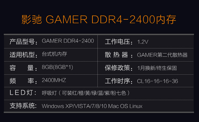 商品名稱:影馳 GAMER DDR4 2400 8G 臺式機(jī)內(nèi)存 內(nèi)存條 燈條 呼吸燈 燈光內(nèi)存