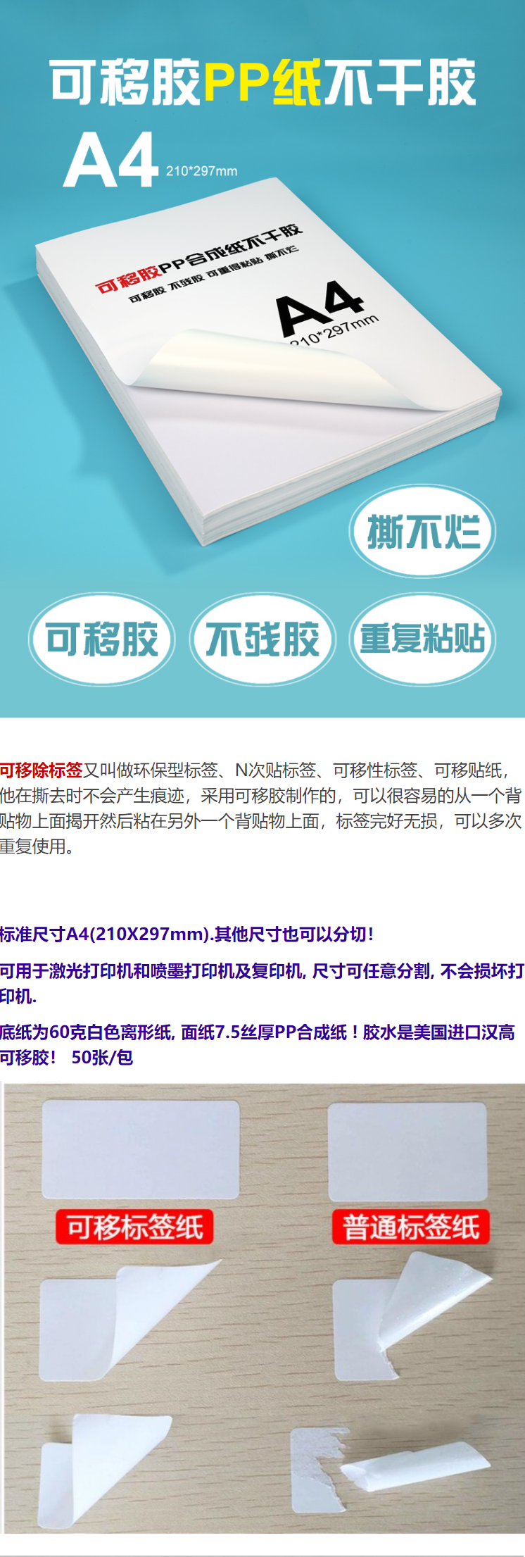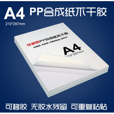 商品名稱:A4 亮光 不干膠標簽打印紙覆膜背膠粘貼紙 噴墨防水撕不爛耐高溫PET 50張